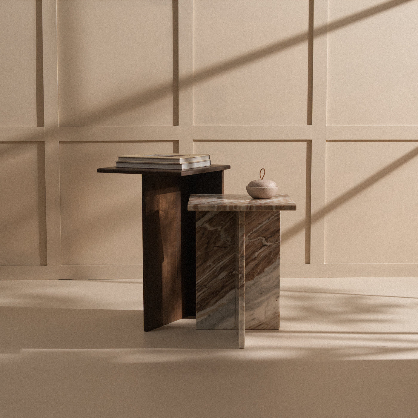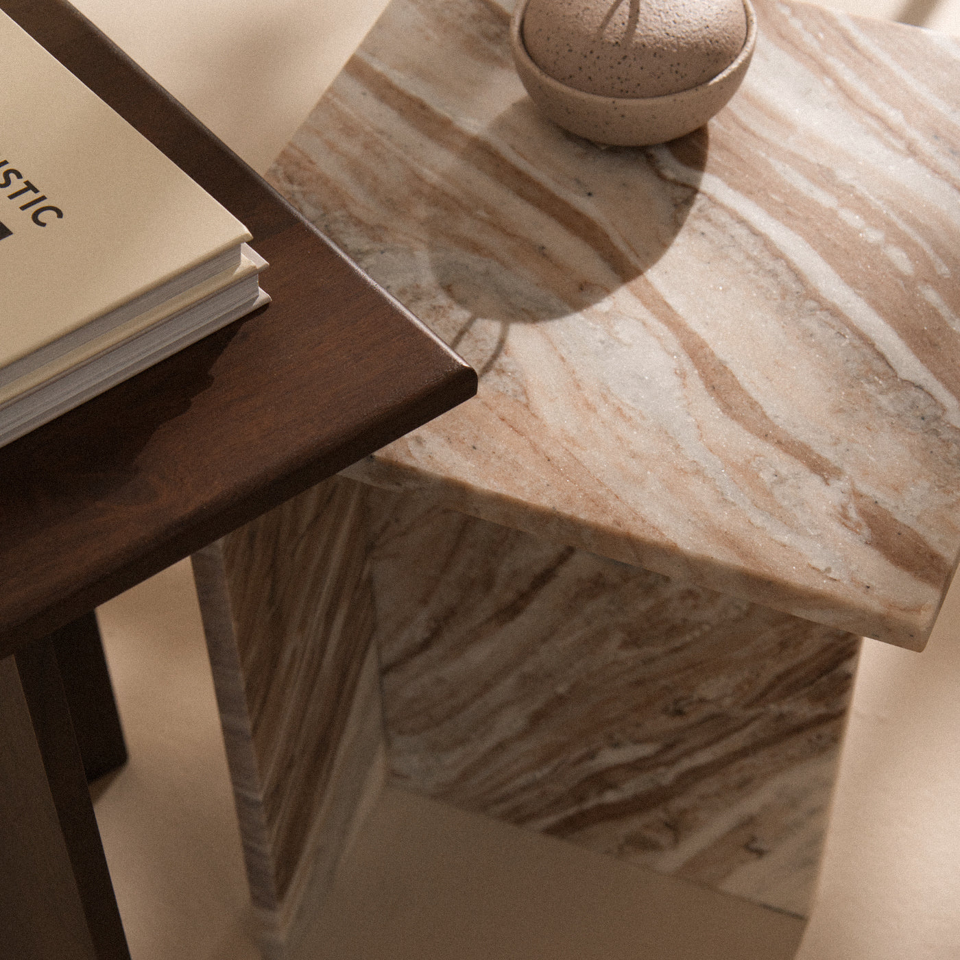 Solid Toronto marble side table with natural veining. Sculptural form designed to nest with walnut Hikari for contrast.