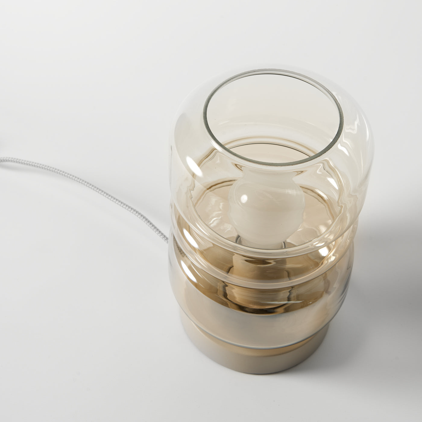 Set on a neutral sand-coloured base with a fabric cord, this low-profile lamp works perfectly on bedside tables, shelves or sideboards. The ribbed glass surface adds texture and light play, while the compact size keeps it understated.