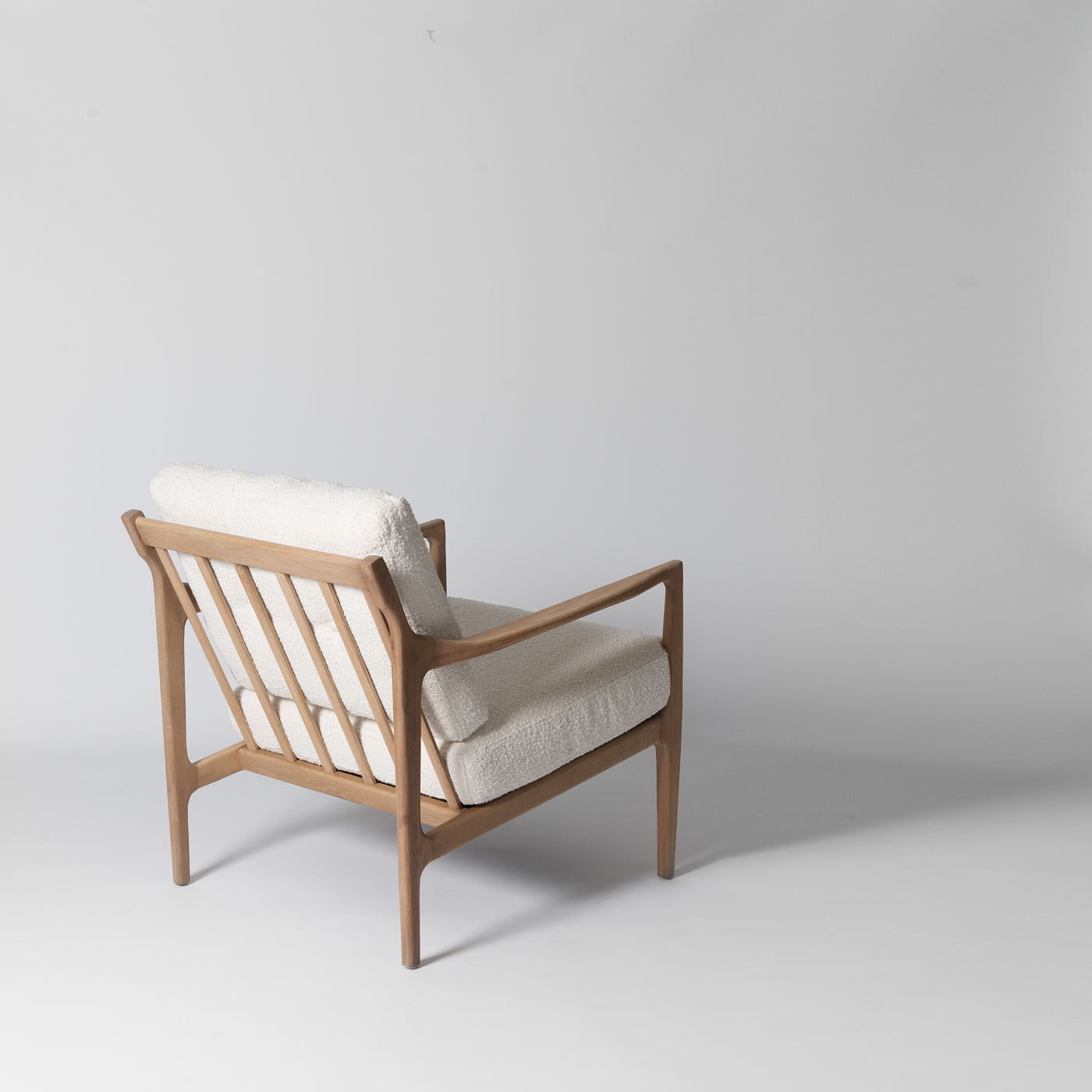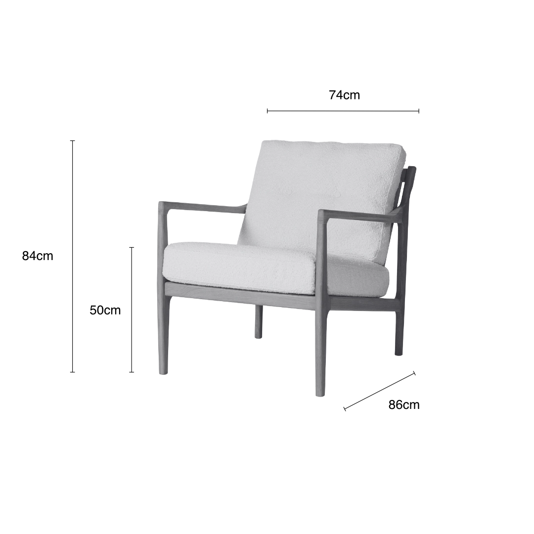 Upholstered in soft white boucle, the plush seat provides a beautiful, tactile contrast to the smooth wood. Its deep, inviting proportions offer a relaxing sit, easily making it your new favourite comfy reading chair.