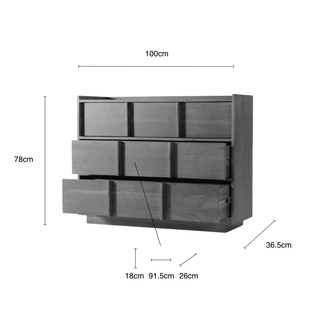 The chest is meticulously finished in a deep dark walnut, a shade that enriches the natural character of the acacia and provides a durable, smooth surface. It features three spacious, full-width drawers, offering generous capacity to keep your garments or essentials neatly organised. The Hana is a robust and functional addition, designed for daily utility and timeless appeal.