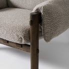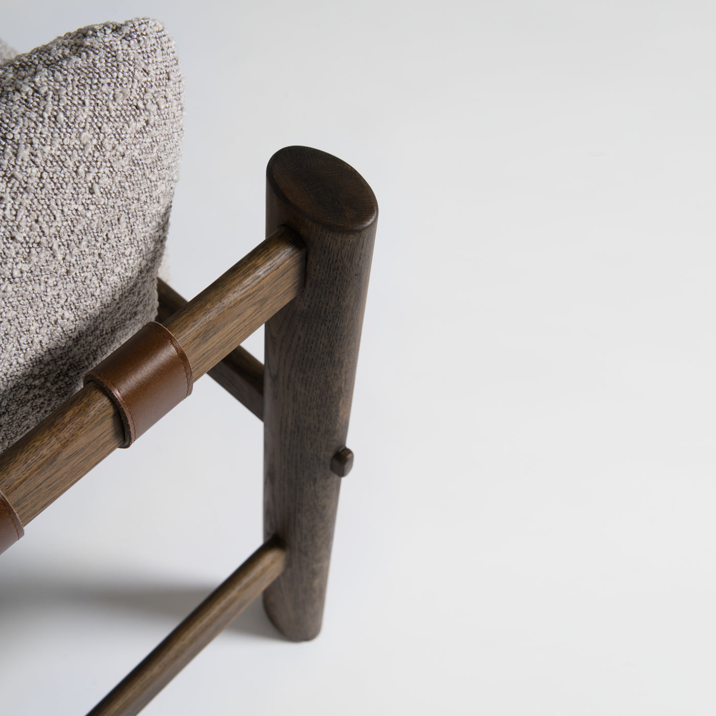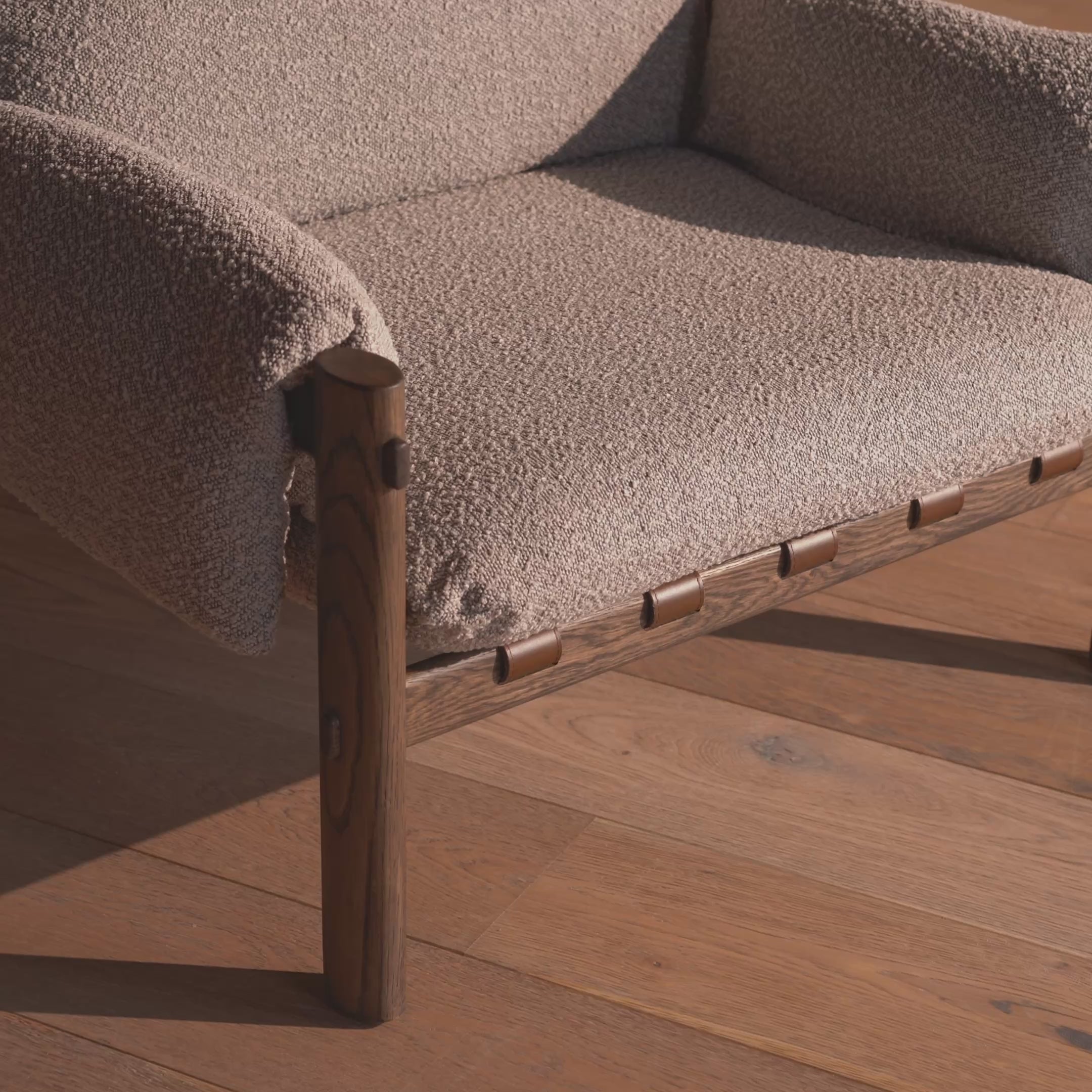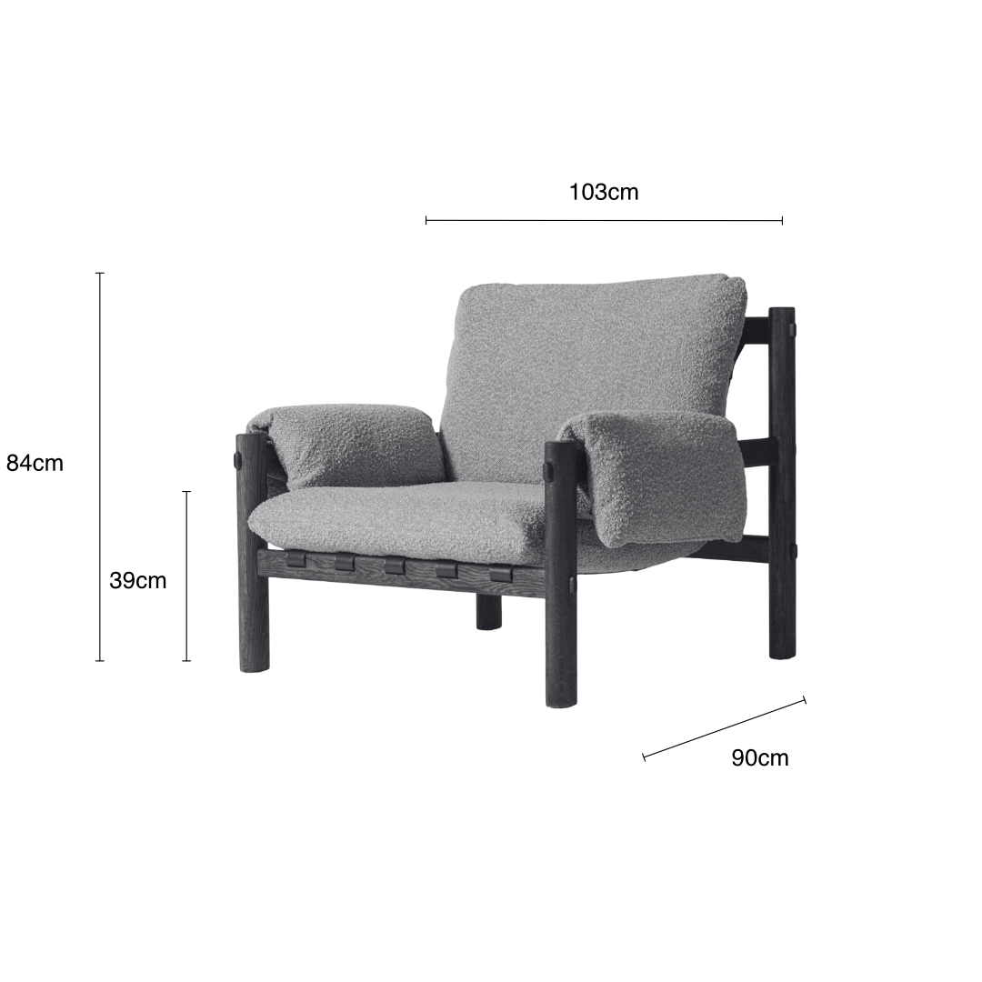 Solid dark oak frame with grey boucle cushions and leather strap detail. Architectural lounge chair built for comfort and longevity