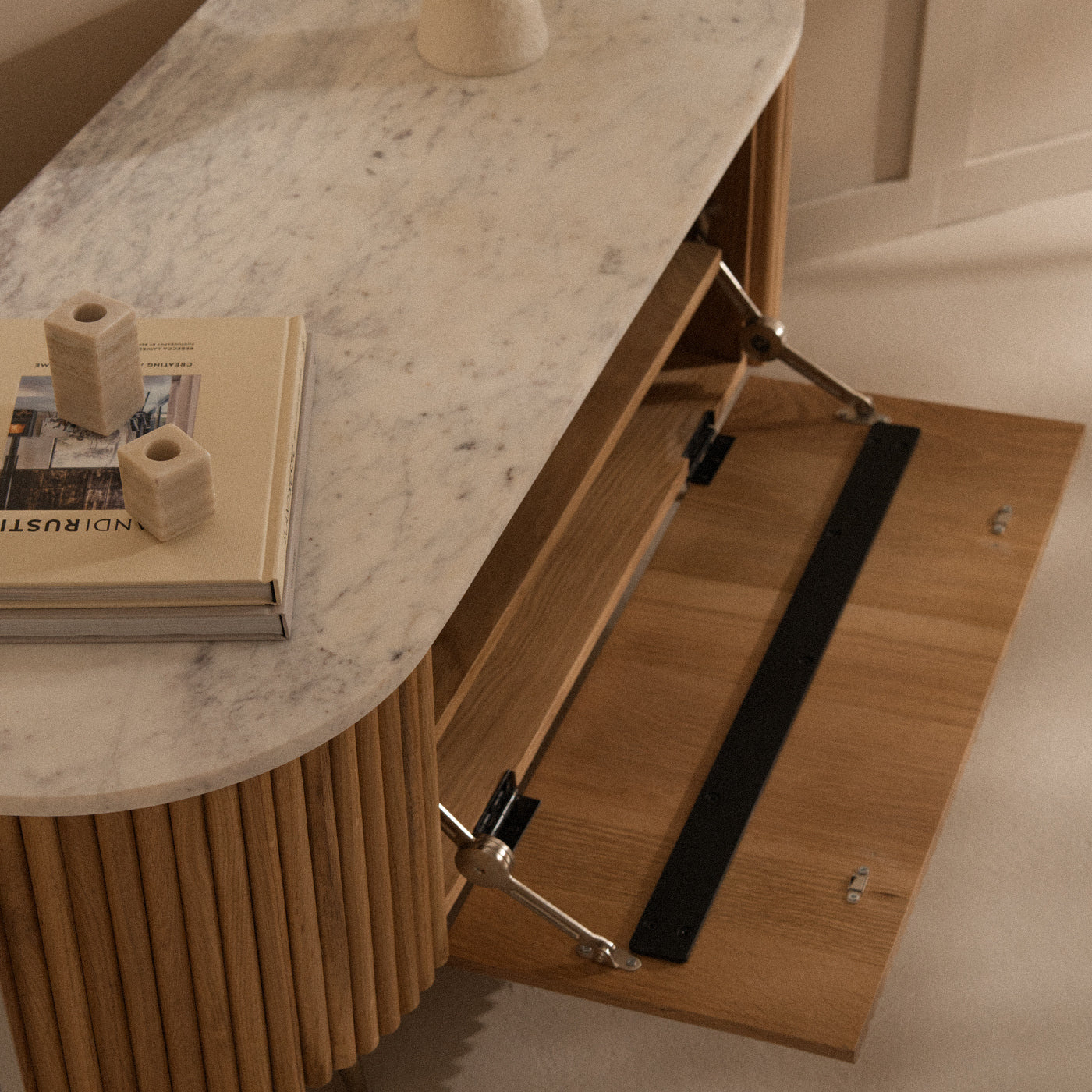 Handmade from solid FSC-certified oak and topped with smooth Banswara white marble, this light oak corner media unit features ribbed doors that bring real texture and depth to your living area. Finished in a warm, natural tone, the wood’s grain is allowed to shine through, giving the piece a grounded, organic character.