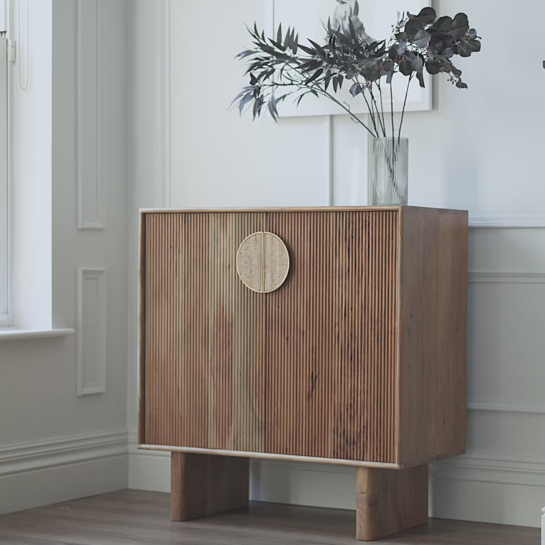 Our Edvard acacia ribbed drinks cabinet is a functional piece that adds character and texture. Made from acacia wood with brass handles and cork detailing, its bold yet sophisticated design complements both modern and traditional décor.
