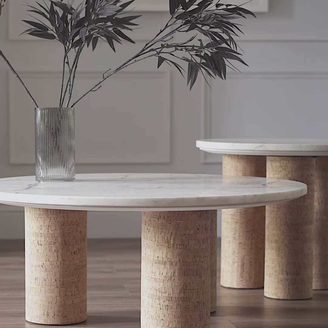 Its sleek white surface contrasts with the textured cork coffee table legs, creating an unusual mix of rustic and refined features. This, along with the neutral colour palette, makes this coffee table a great choice to complement a variety of interior design styles.