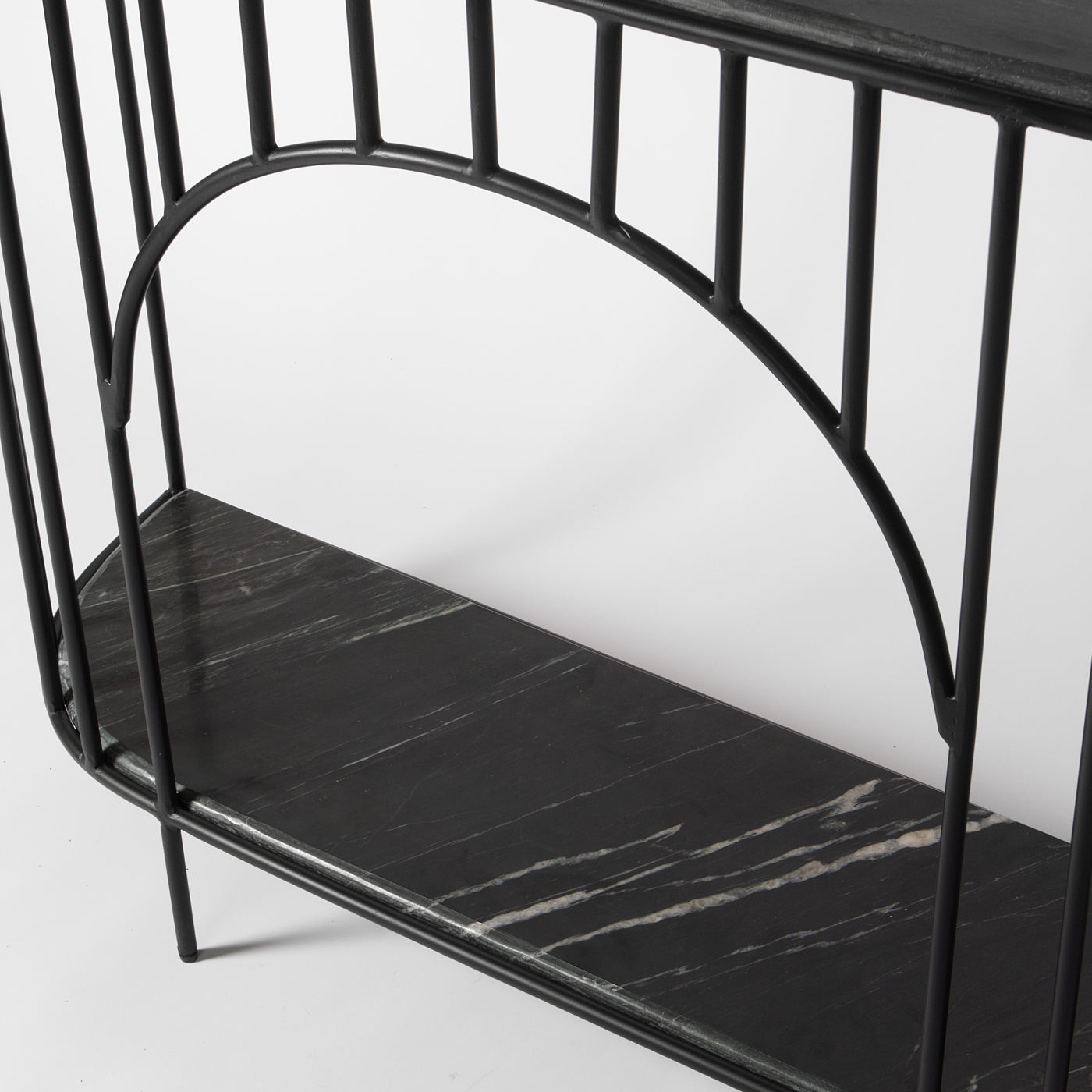 Its all-black design features stunning black marble shelves set in a matte black metalwork frame, making this table a great addition to monochrome or Japandi spaces. The open sides feature a metal arch design inspired by 1920s Art Deco forms, grounding this piece with a classical feel.