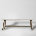 Solid mango wood bench with a wonky, carved finish. Durable, full-length seating option with a natural, unstained look.