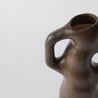 Ox blood brown stoneware vase with a wonky silhouette. A sculptural accent piece that balances rustic tone with modern design.
